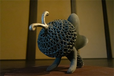 タイトル「玉しい」空中に浮いている「たましい」を表現した球体の作品。それぞれのモチーフに遊び心を込めた。