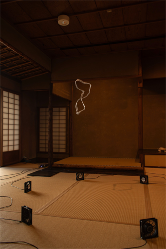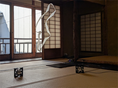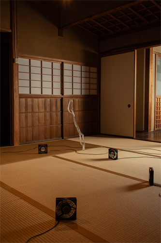 その情報に基づき床上のファンはリアルタイムで出⼒を制御されている。⾵を捉え、再構成する⼀連のシステムは⽇本における空気と呼ばれる概念について実践的考察を⽬的としている。