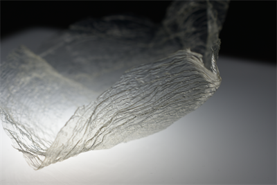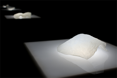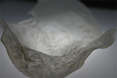 牛乳の膜で手形を作ったり、色んな形を実験したんですけど、脂肪が多いものだとぷく~と膨らみますし、低脂肪だとシワシワの状態になりますし、脂肪分が少ないと、乾いた時にそったりとか。作りながら見てる膜の表情。膜とのやりとりかな。