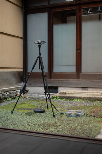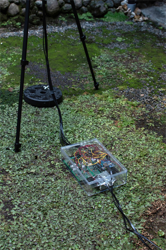 気配や存在感と関連付けられる超低周波の空気振動(聞こえない⾳)を数値化する為に⼩型マイクを応⽤したシンプルなセンサシステムを設計し、屋外に設置されたセンサはこの地の⾵のデータを常に計測する。