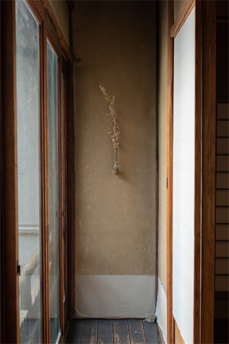 沖縄在住時より、沖縄の⾃⽣植物である⽉桃でしめ飾りを作ってきた。正⽉に年神を迎え⼊れる神聖な場所(結界)を表す。