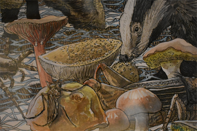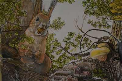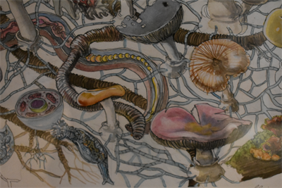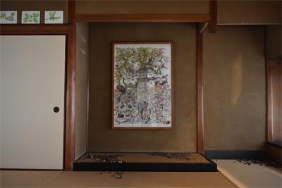 ⽊の枝には⾍や⿃や地⾐類、地⾯には異なる動植物が、根の部分には菌類が鬱蒼とし、四季の変化を表す。
