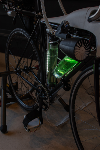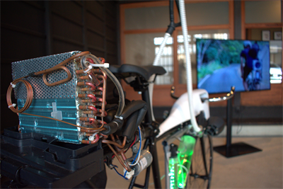 ⺟なる⾃転⾞と⼈間が共⽣するサイボーグの創造を通じて、⾼度テクノロジー社会で求められる新しい倫理観や技術観を探究するプロジェクトとして構想された。ペダリングと呼吸を強制的に同期させるRespiCycle Systemによって、私たちの⽣命維持は⾃転⾞に委ねられ、移動環境でスピルリナを培養するTeraCycle Systemによって、⾷糧や⽔分の摂取すら外部化される。映像では⾃転⾞に従属した⼈間の葛藤が描かれるが、その過程で⾃転⾞という技術的な存在との関係は移り変わっていく。テクノロジーの過剰について描く本作は、テクノロジーとのハイブリッドという今⽇の私たちの⽣き様そのものについて、私たちに再考を促す。