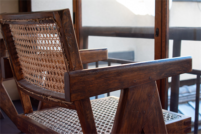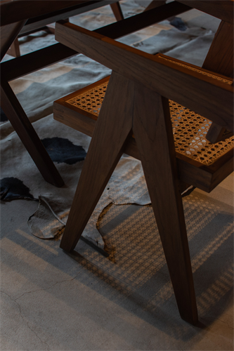 木材や籐などの軽量素材を用い、対角線を効果的に取り入れた幾何学的構成は、ジャンヌレの家具や建築における大きな特徴です。